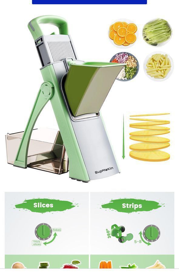 Adjustable mandoline for slicing and chopping fruits and vegetables. Durable, easy to use, and perfect for kitchen prep.