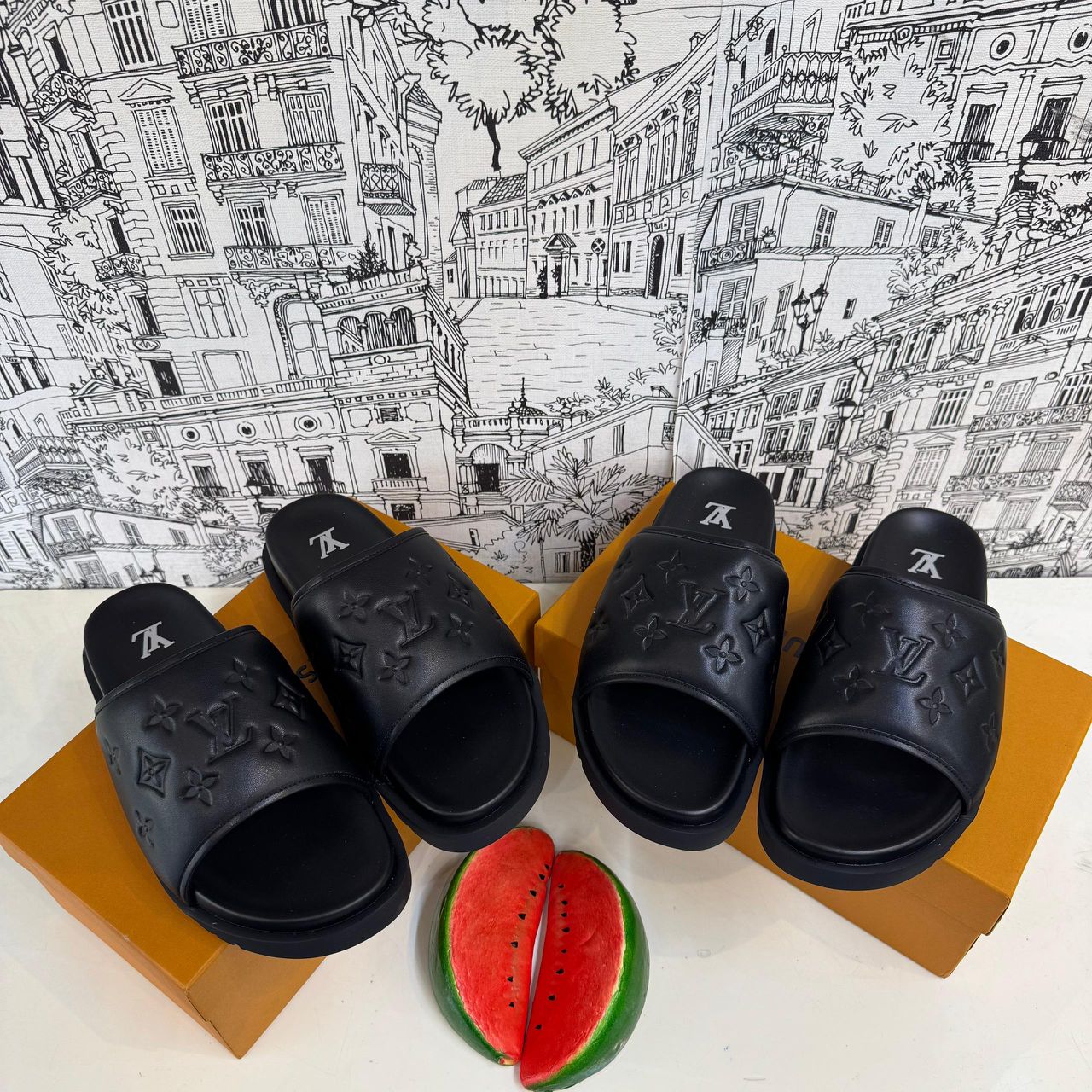Tags: casual luxury, designer slippers, high-end comfort, iconic logo, Louis Vuitton, luxury footwear, men's slippers, premium materials, slippers, stylish home wear