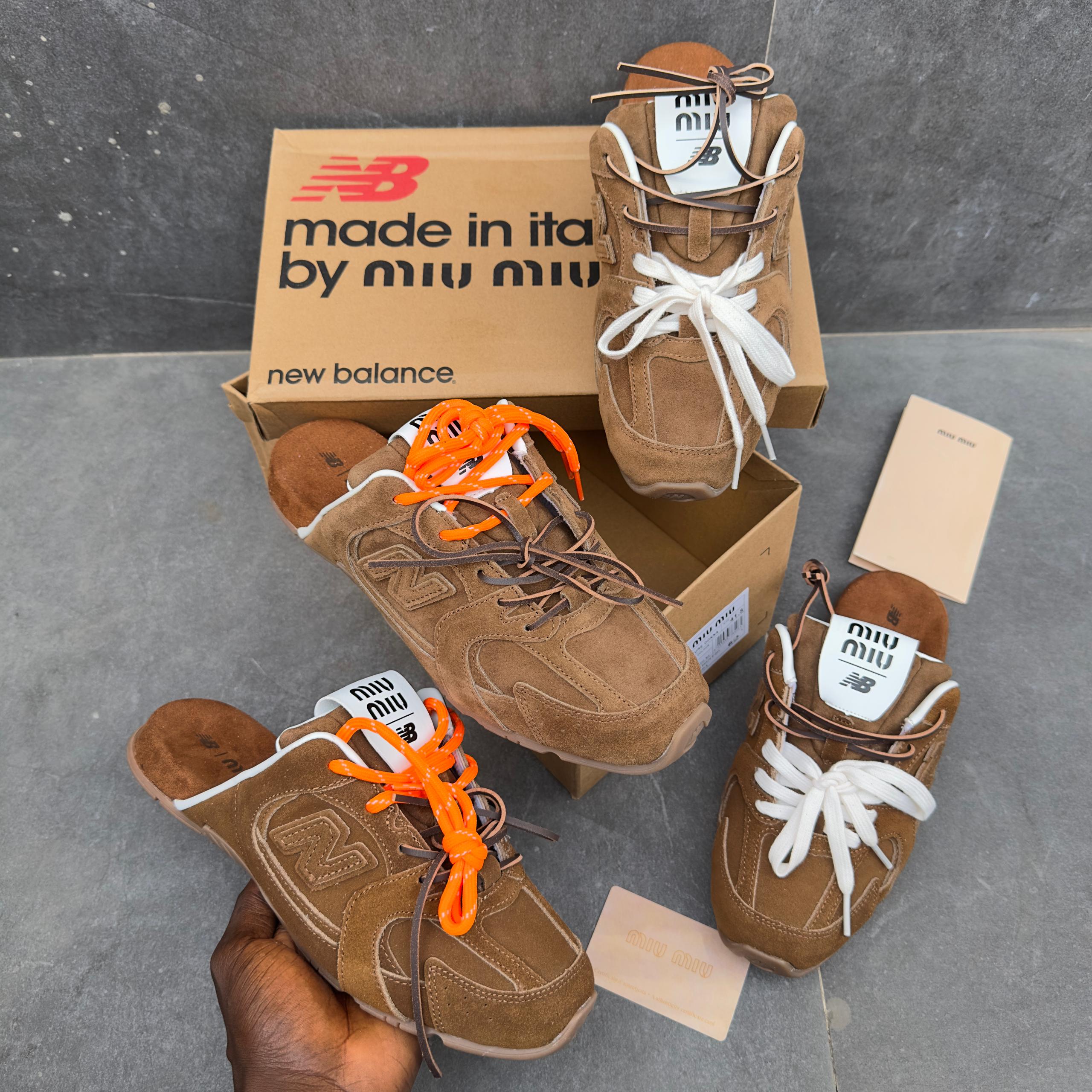 Tags: calf leather mules, designer footwear, exclusive sneakers, fashion collaboration, luxury sneakers, Miu Miu x New Balance, premium calf leather, stylish mules, unisex shoes